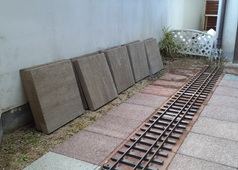 (2)転車台の床工事、これが問題だ。当初、実物のように円形に掘り下げた床をイメージしていたが、施工方法が行き詰まってしまった。う〜む。発想の転換。桁が旋回できればいいわけで、円形にこだわる必要はない。一段下がったフラットな床面があればそれでいい。桁がL=1200mmなら、床面も1200mm×1200mm。いまの整備場のようにコンクリートの平板を並べればいいのだ。