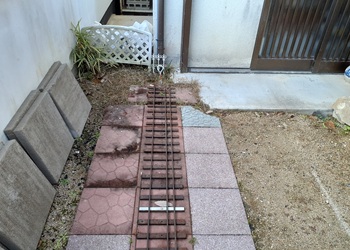 400mm×400mmのコンクリート平板を使うアイデアが浮上したのは、その現物が手元にあるから。第四工期の雨水マスの加工の際に邪魔者になっていた【下画像左】。これを活用すればいいのだ。しかし、話はそんなに簡単に進まない。ホームセンターで探しても300mmはいくらでもあるのに400mmは見当たらない。ネットも同じ。う〜む。手元に現物があるのに商品がない。転車台の計画は中断してしまった。