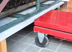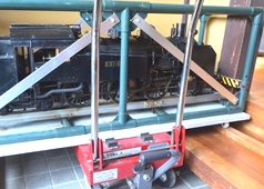 ケージを載せた床板もいっしょに持ち上げるのはどうだろう。床板の下に台車を入れてリフトアップすれば機関車が持ち上がる。左右のキャスターの位置がシンメトリーじゃなくてカッコ悪いが、まあ、台車を入れてみよう……。う〜ん、台車が入らない【上画像】。それなら床板を台車の高さまで持ち上げればいい。その差は25mm。