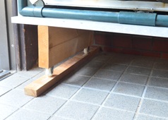 ジャンクから厚さ25mmの角材を探し出して、左右のキャスターの下に入れてみた【上画像】。ここは力技で床板を持ち上げる。これでどうだ!?