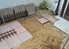 さて、どこから線路を敷こうかな。イメージをめぐらせているとちょっとした降雨。あれ、やっぱり水たまりができるなあ。植栽を除いて整地しても、縁側寄りの水たまりは以前のまま。この際、排水対策を考えよう。床下の荒れた状態や、並んだ敷石がフラットでないのも気になっていた。線路の敷設前に、庭の整地(その2)。